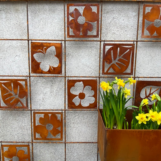 Prydnadsplattorna är 13 x 13 cm med hål i varje hörn för fastsättning. Ståltråd för fastsättning medföljer. -