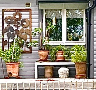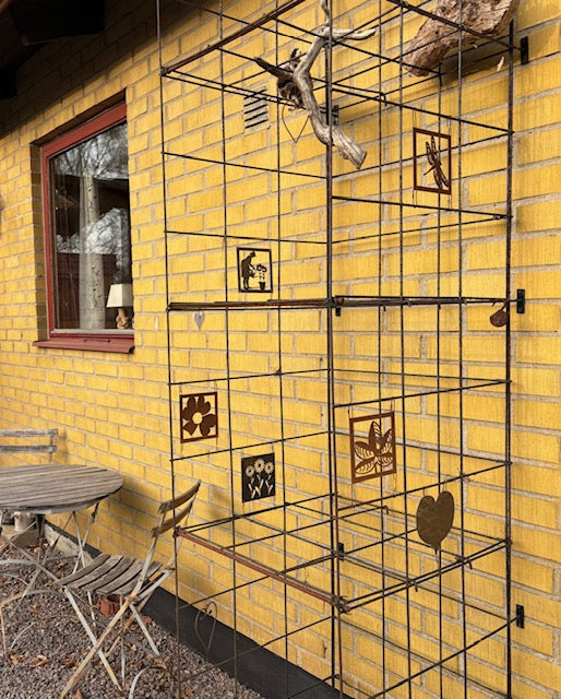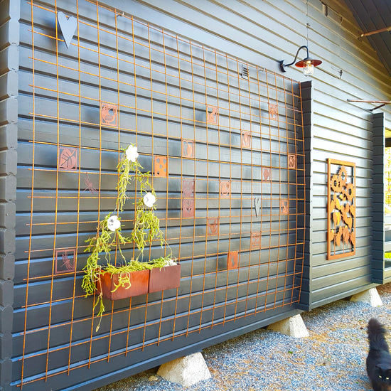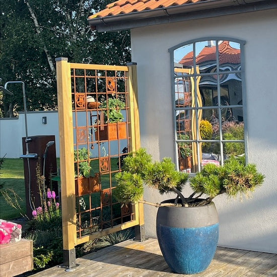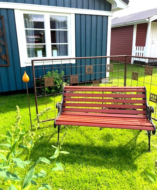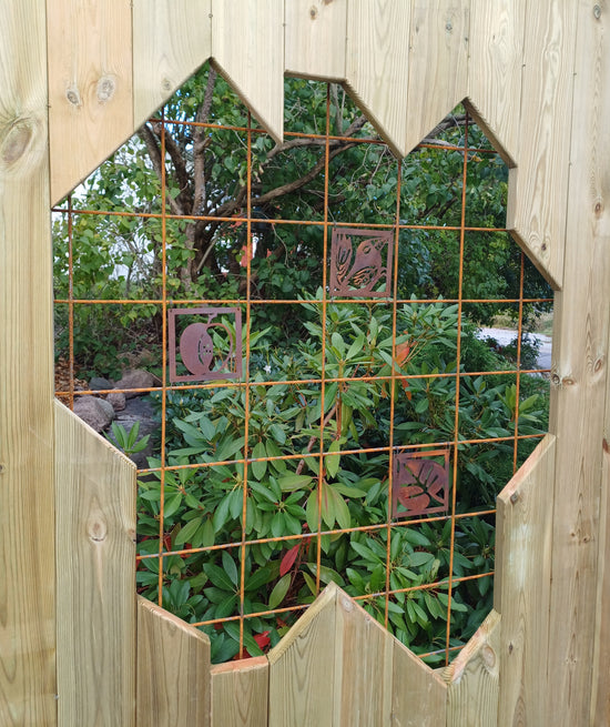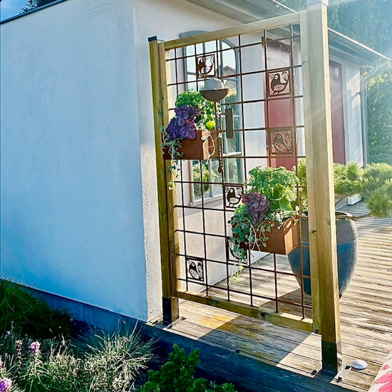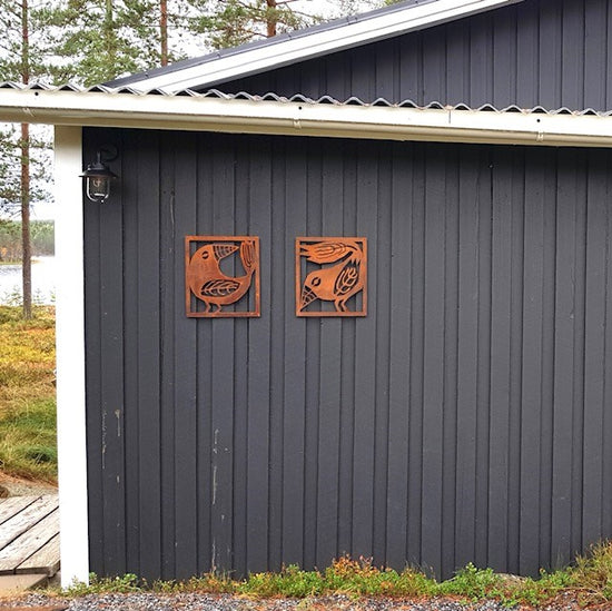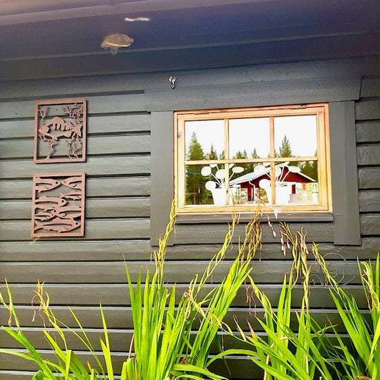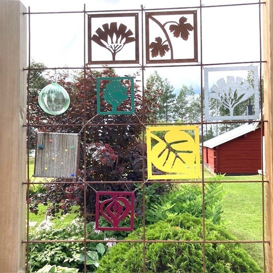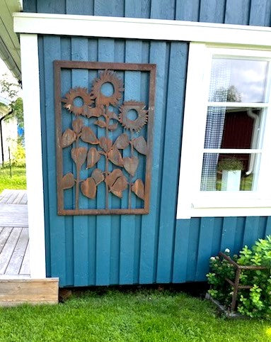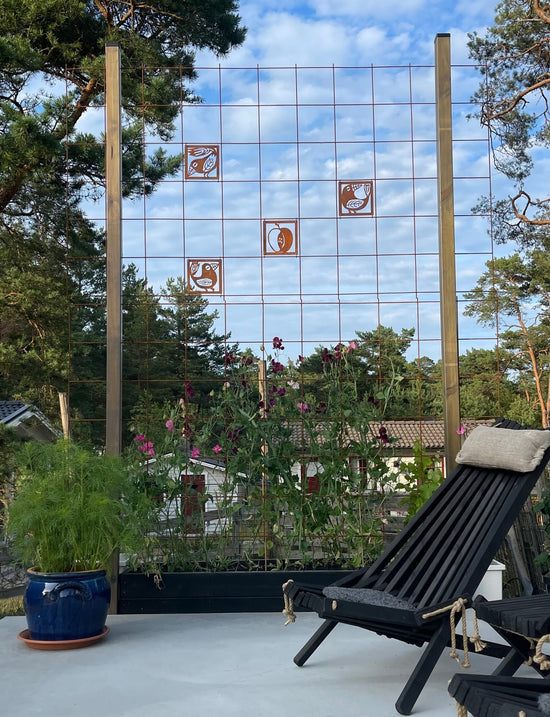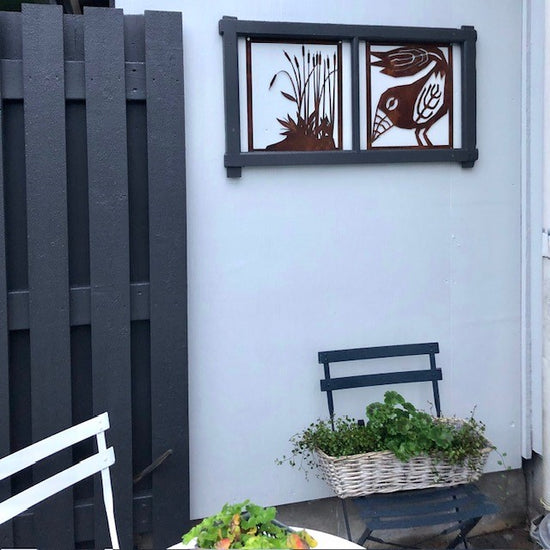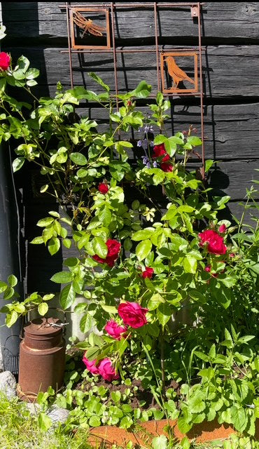 - Vi har en liten uteplats där vi satt upp ett "fuskfönster" på baksidan av ett förråd. Något saknades- Två rosttavlor! Vi är mycket nöjda! /Birgitta