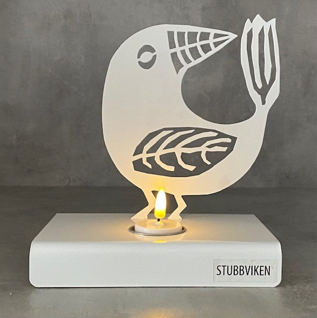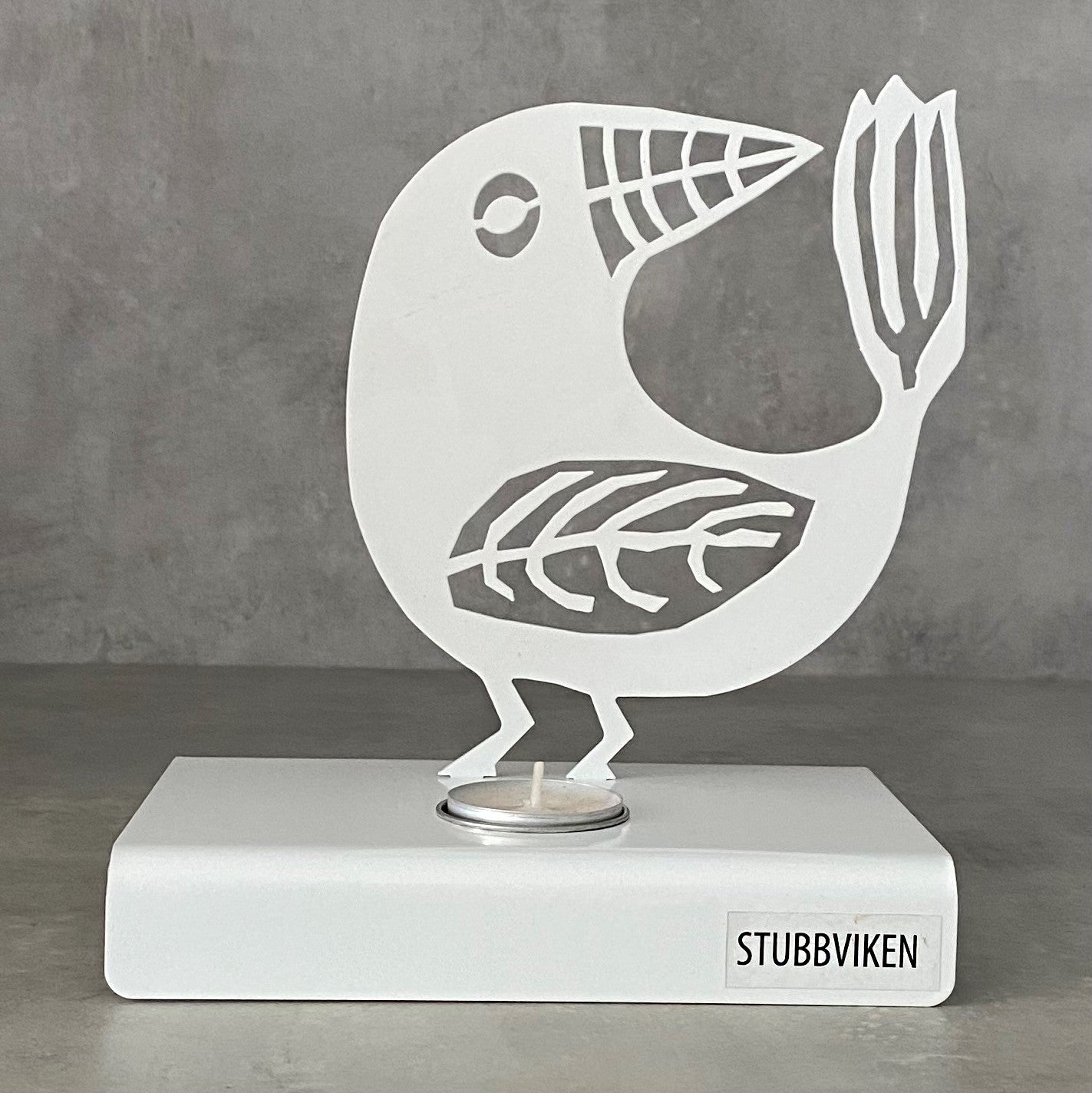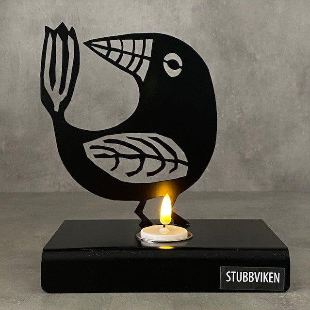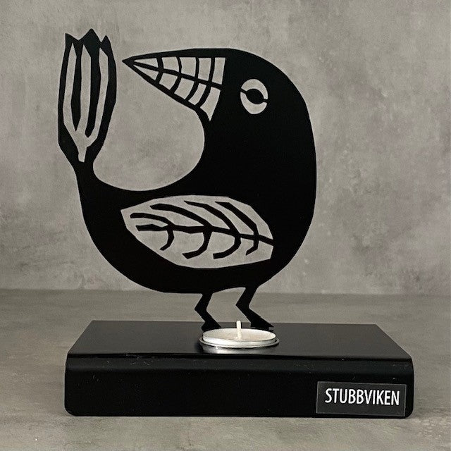 Fågel Fabian i pulverlackerad plåt, monterad på ett underrede med ljuskopp med plats för värmeljus.