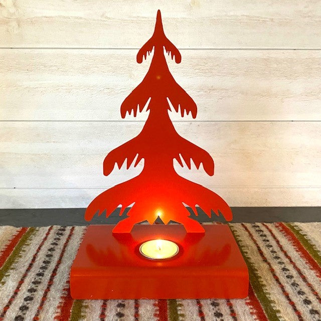 Gran i pulverlackerad plåt, monterad på ett underrede med ljuskopp med plats för värmeljus.