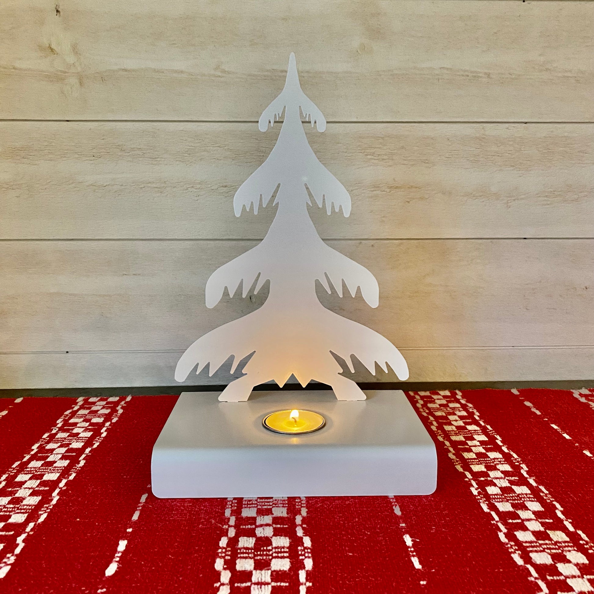 Gran i pulverlackerad plåt, monterad på ett underrede med ljuskopp med plats för värmeljus.