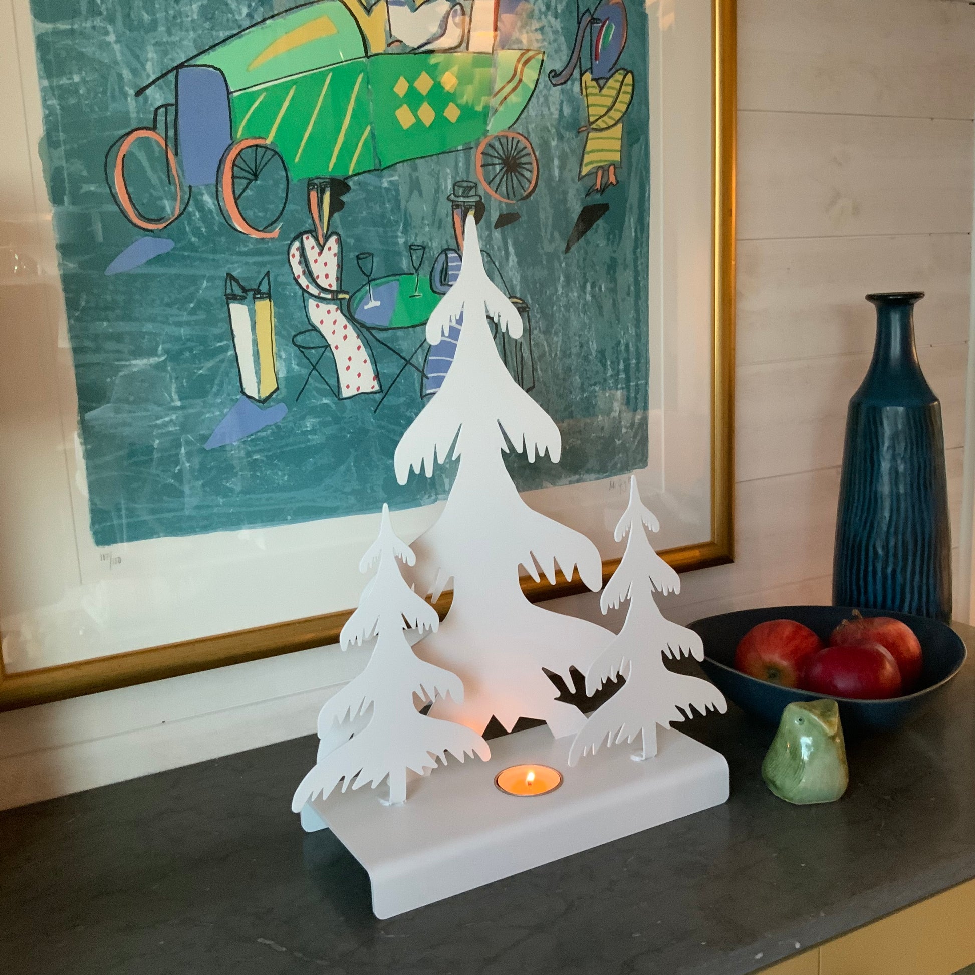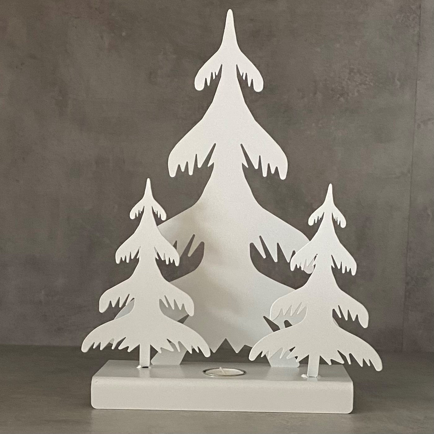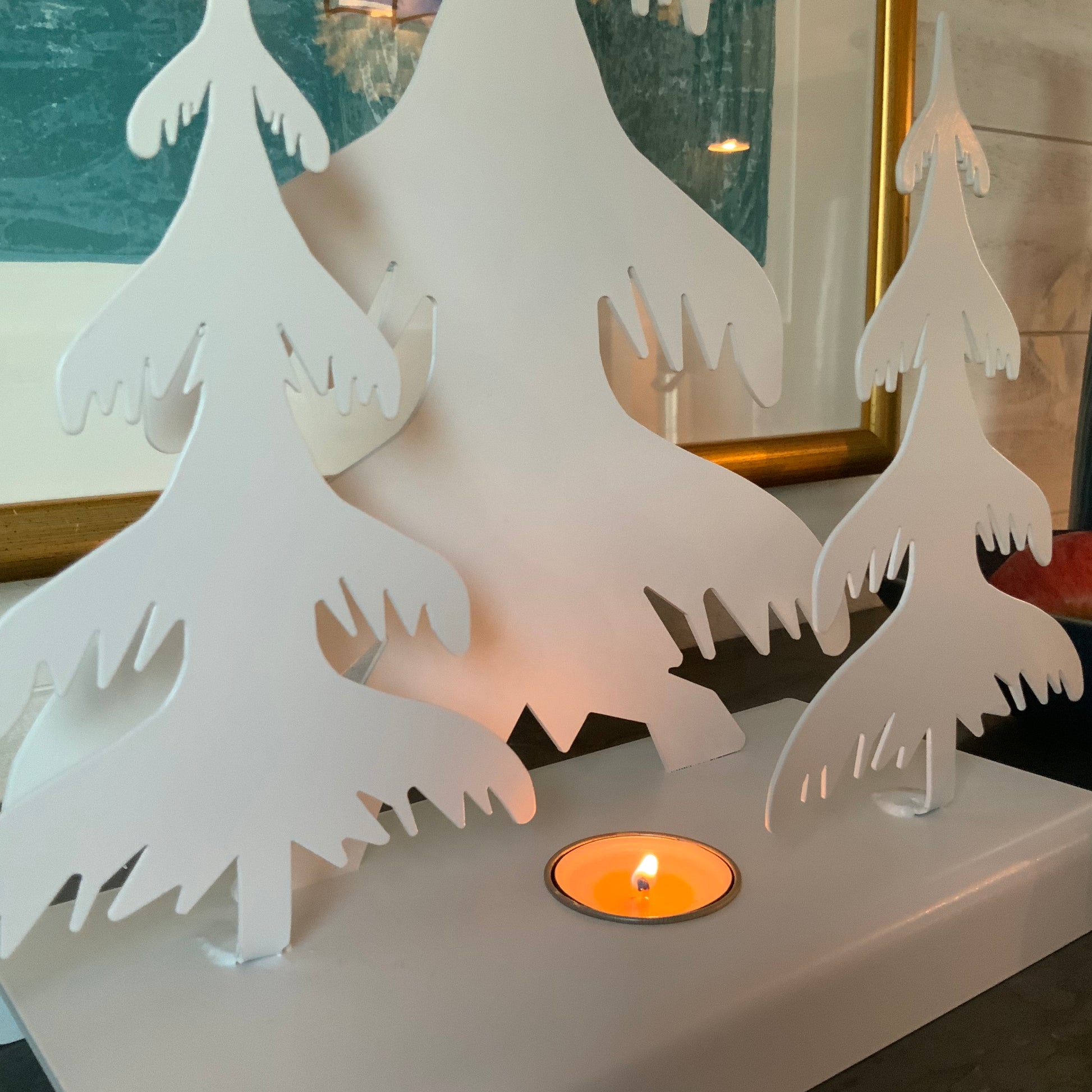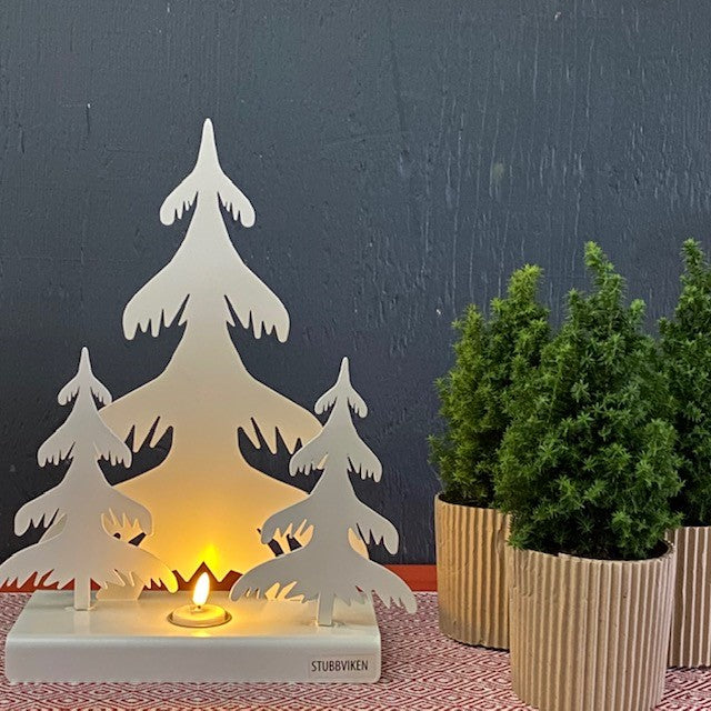 Granar i pulverlackerad plåt, monterade på ett underrede med ljuskopp med plats för värmeljus.