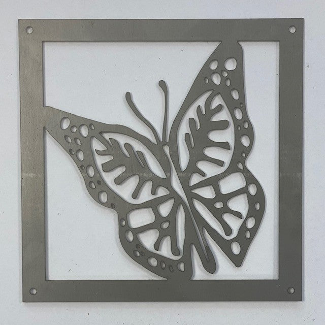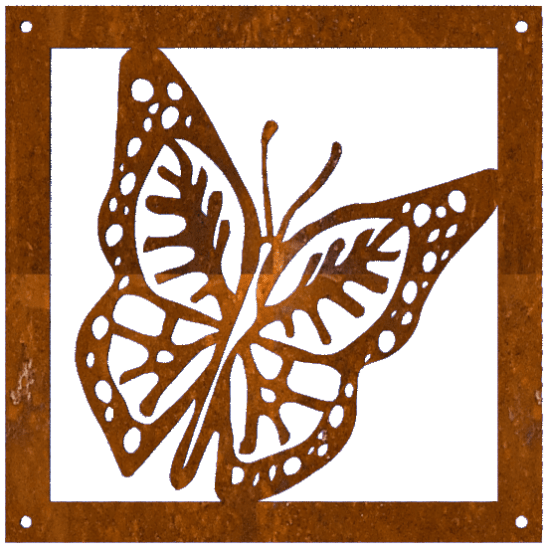 Prydnadsplatta Fjäril Freja tillverkas i cortenstål med måtten 18 x 18 cm med hål i varje hörn för fastsättning. 4 bitar ståltråd medföljer.