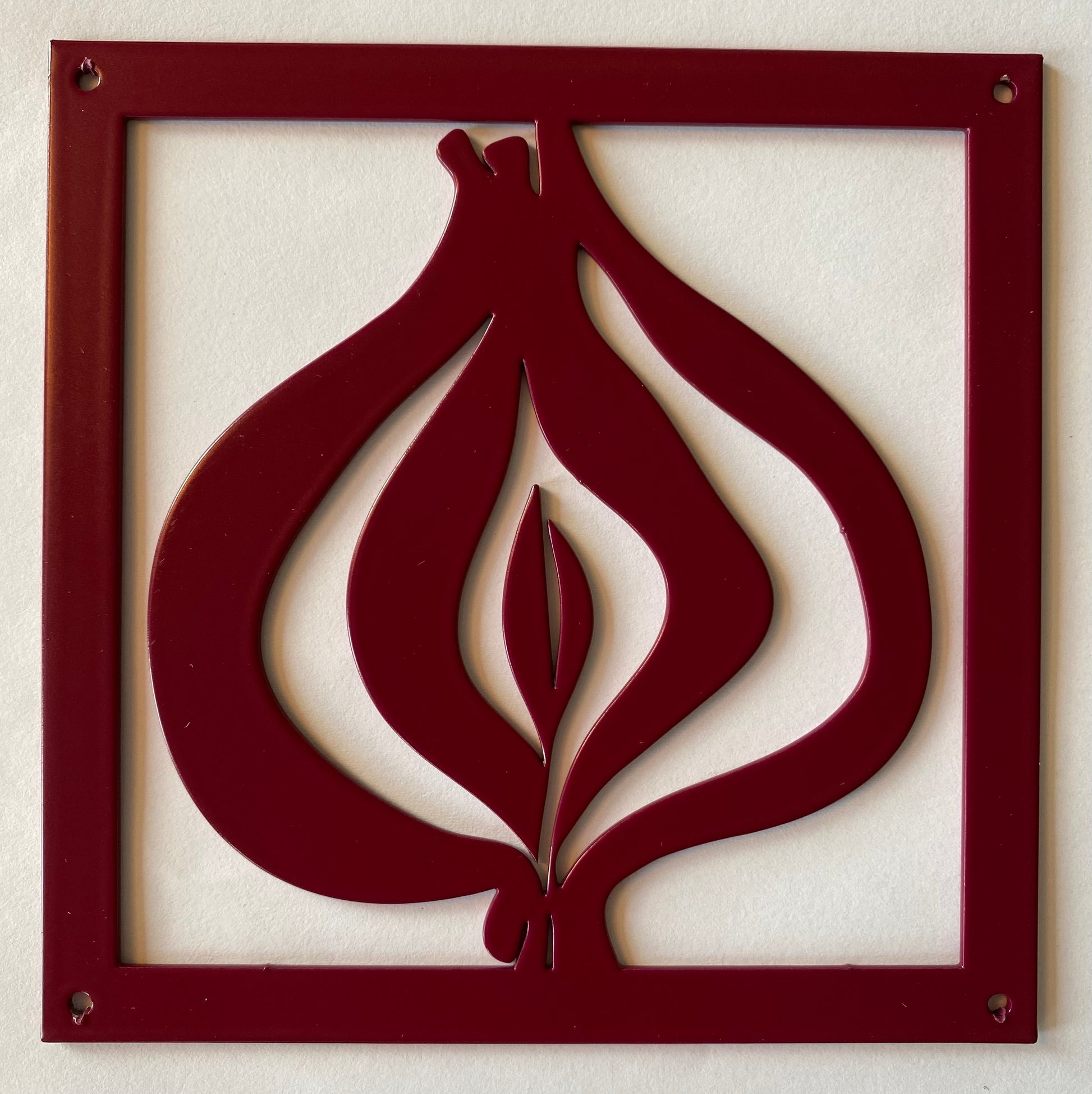 Prydnadsplatta Rödlök tillverkas i pulverlackerad stål med måtten 13 x 13 cm.