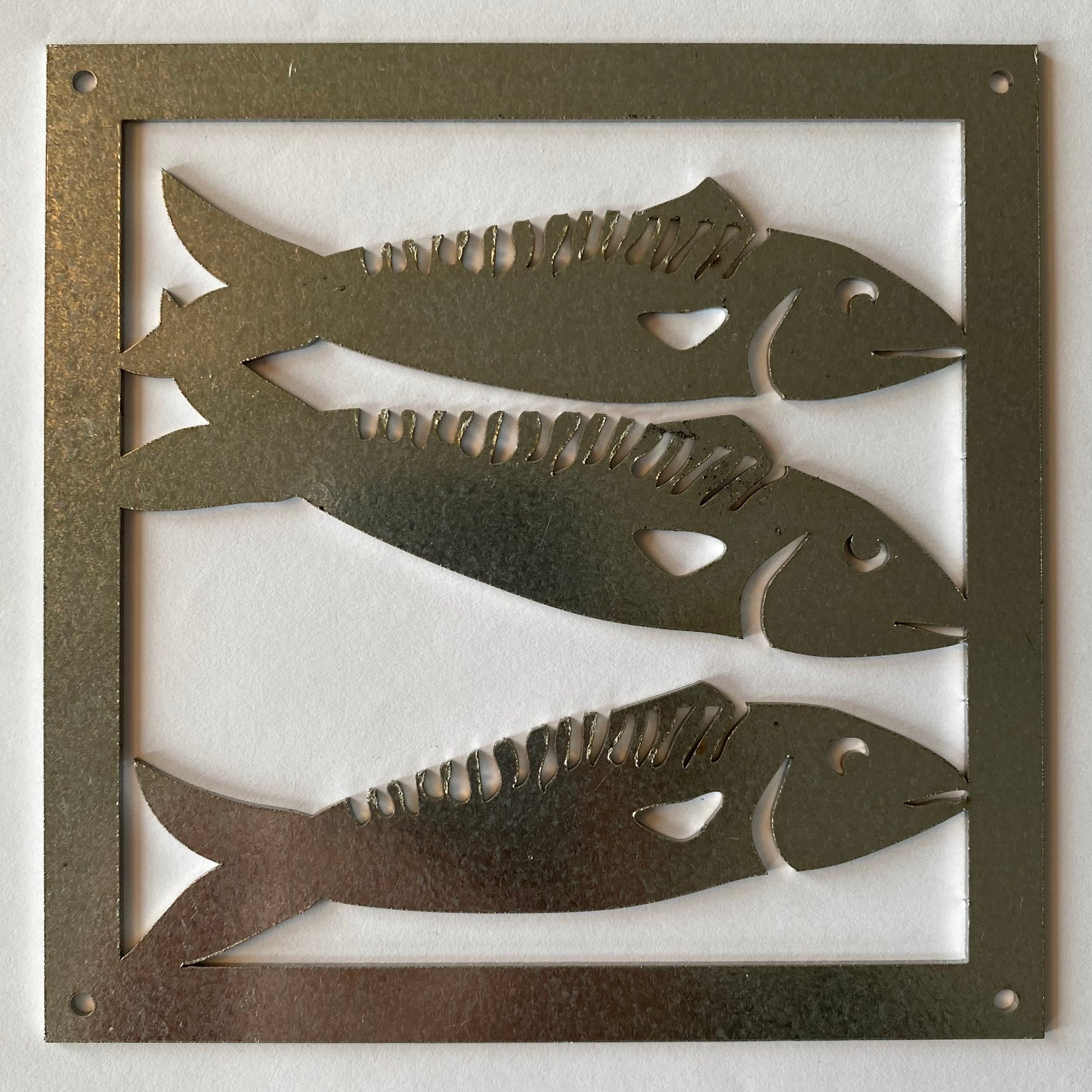 Prydnadsplatta Sardiner tillverkas i zink med måtten 13 x 13 cm. Prydnadsplattan levereras med hål i varje hörn och 4 bitar ståltråd för fastsättning.