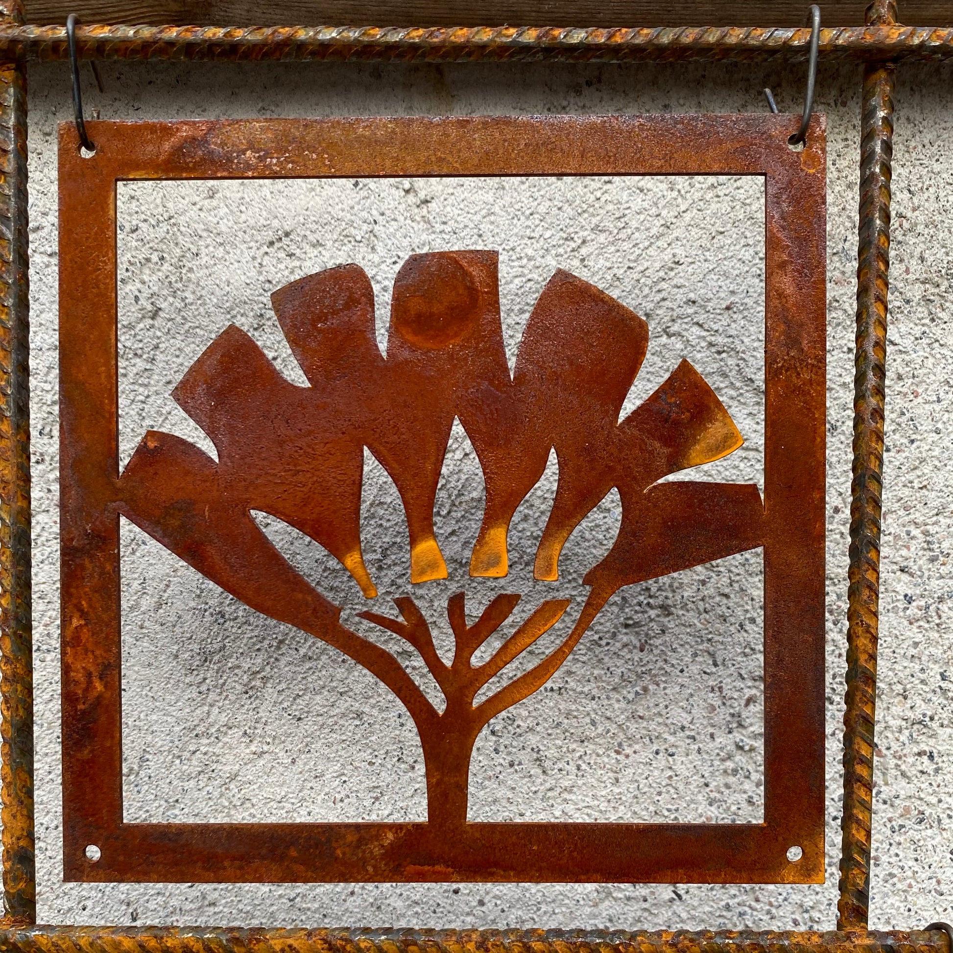 Prydnadsplatta Tistel med ram tillverkas i cortenstål med måtten 18 x18 cm med hål i varje hörn för fastsättning. 4 bitar ståltråd medföljer.