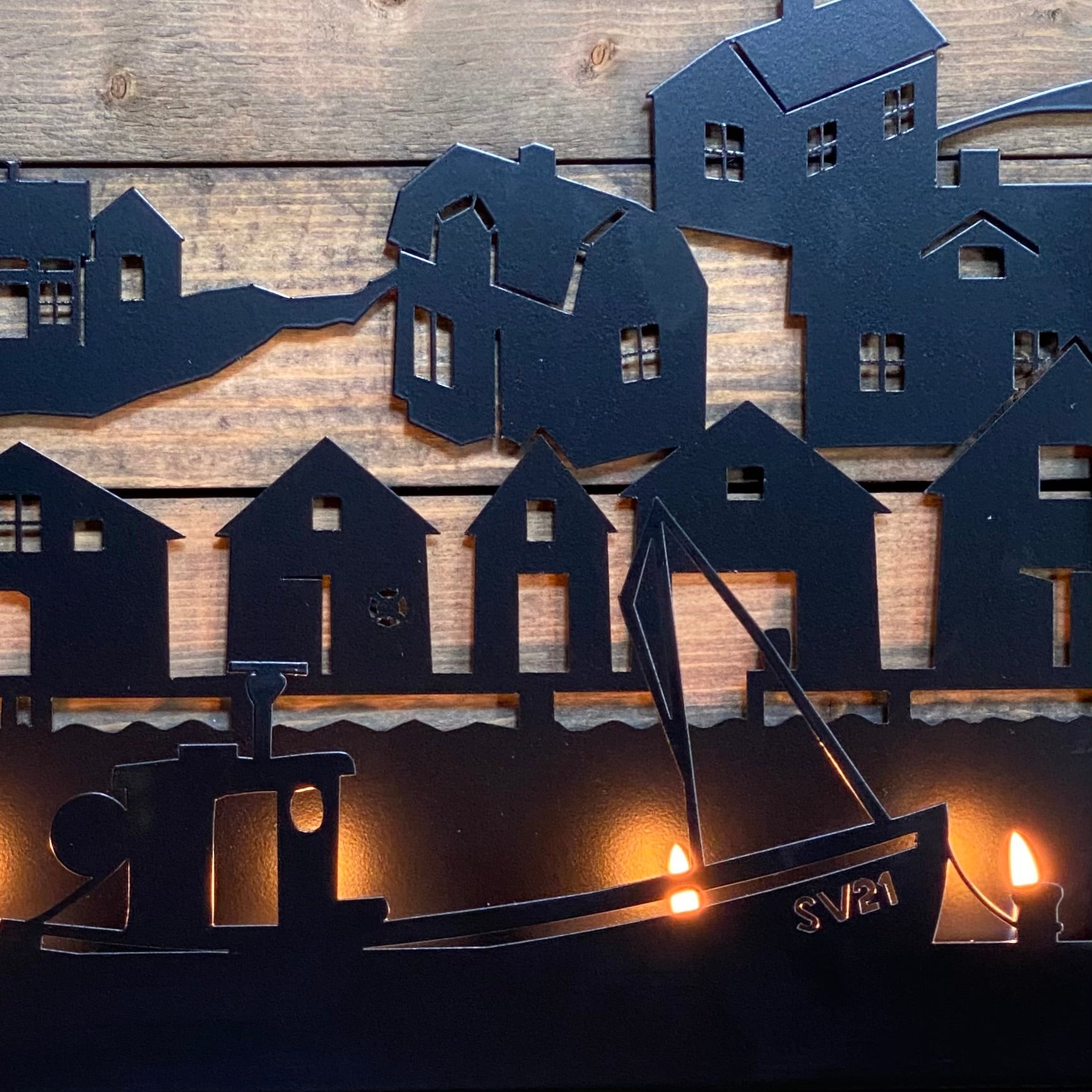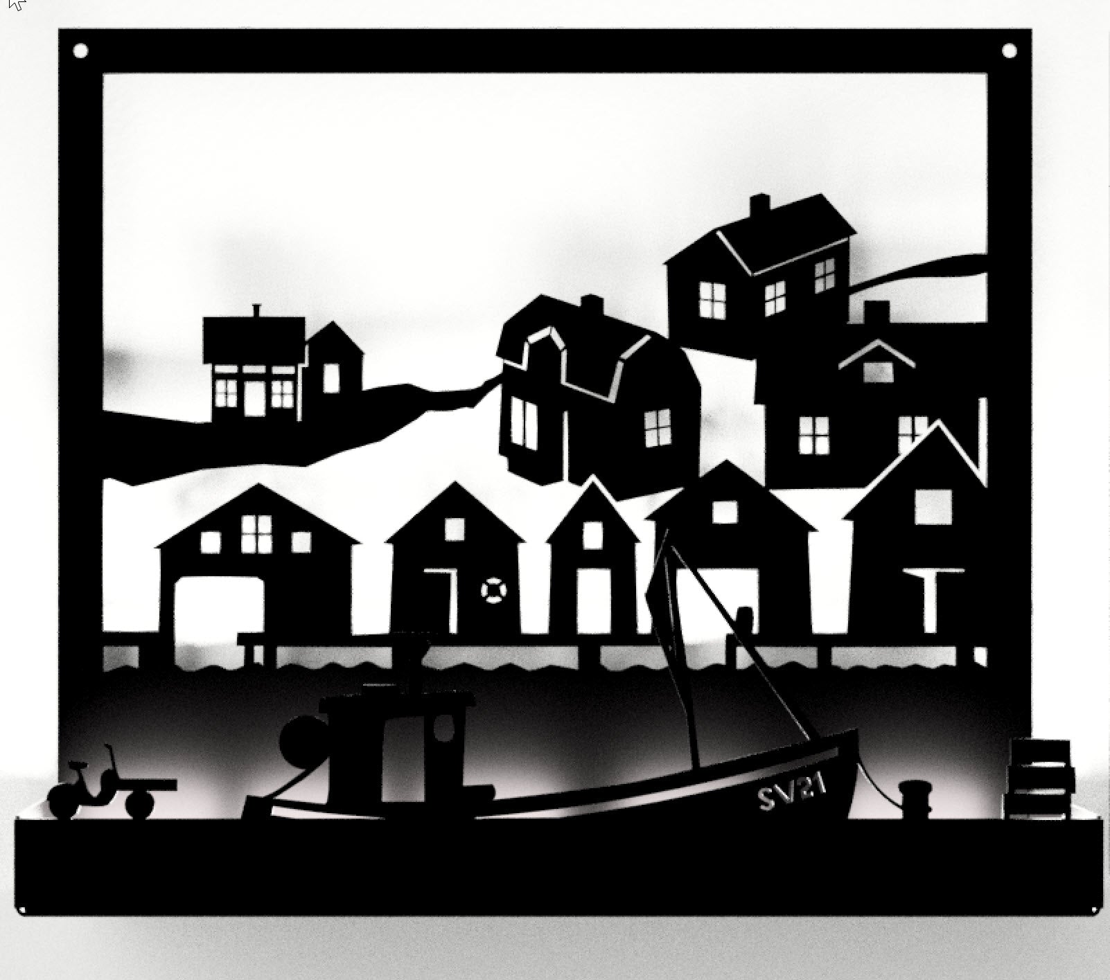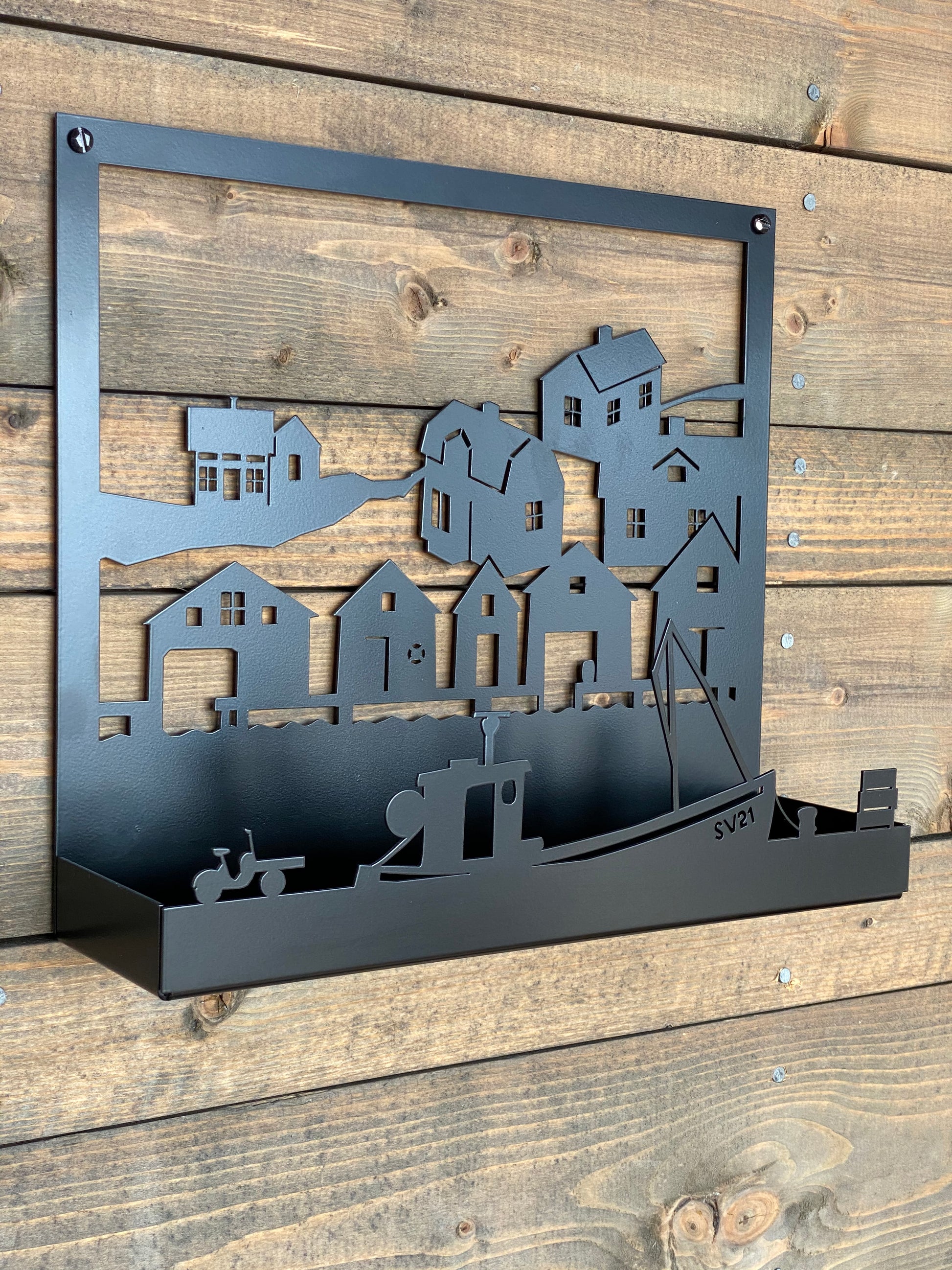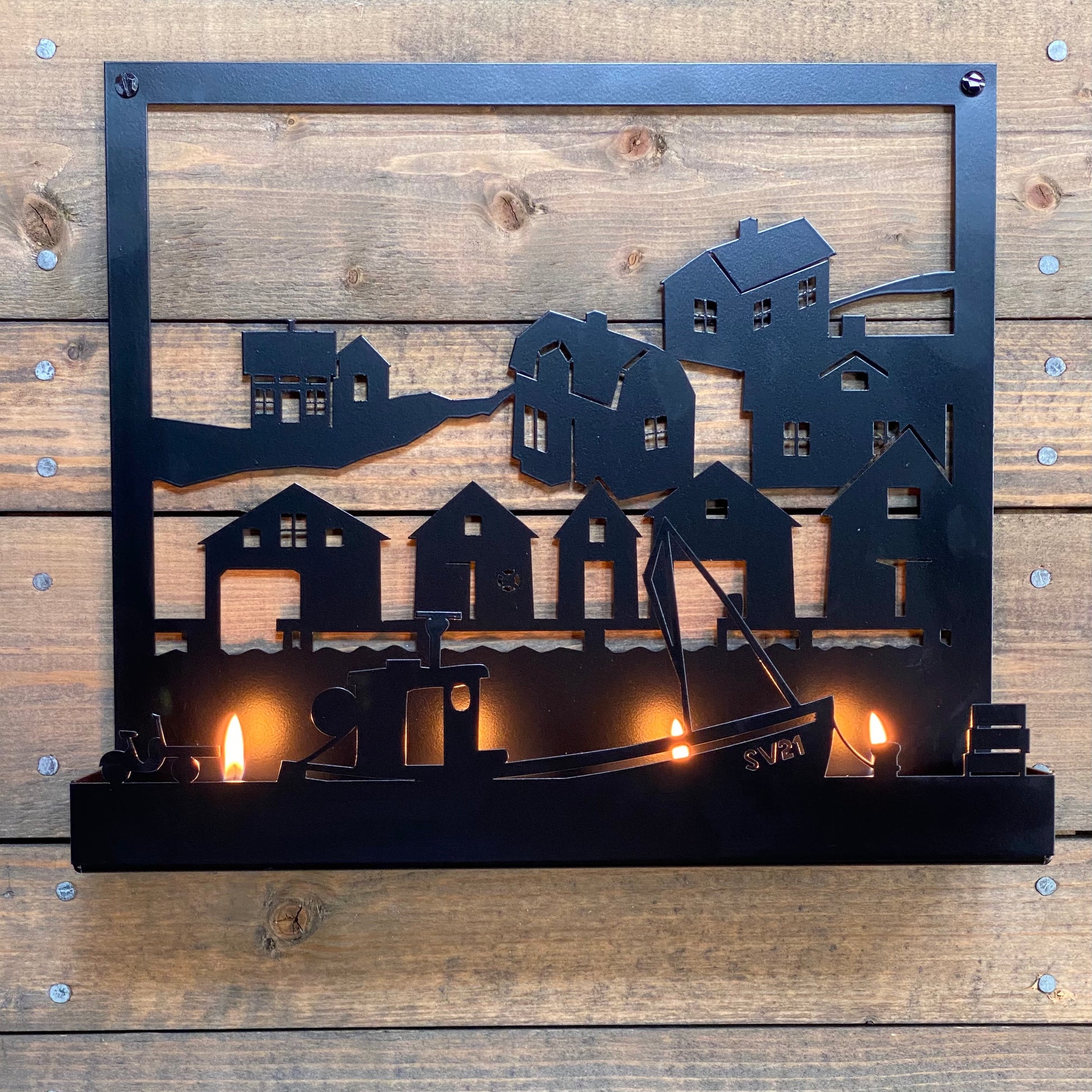 Väggljusstake i svart pulverlackerad plåt. Motivet är ett fiskeläge med fiskebåt, sjöbodar och bostadshus.