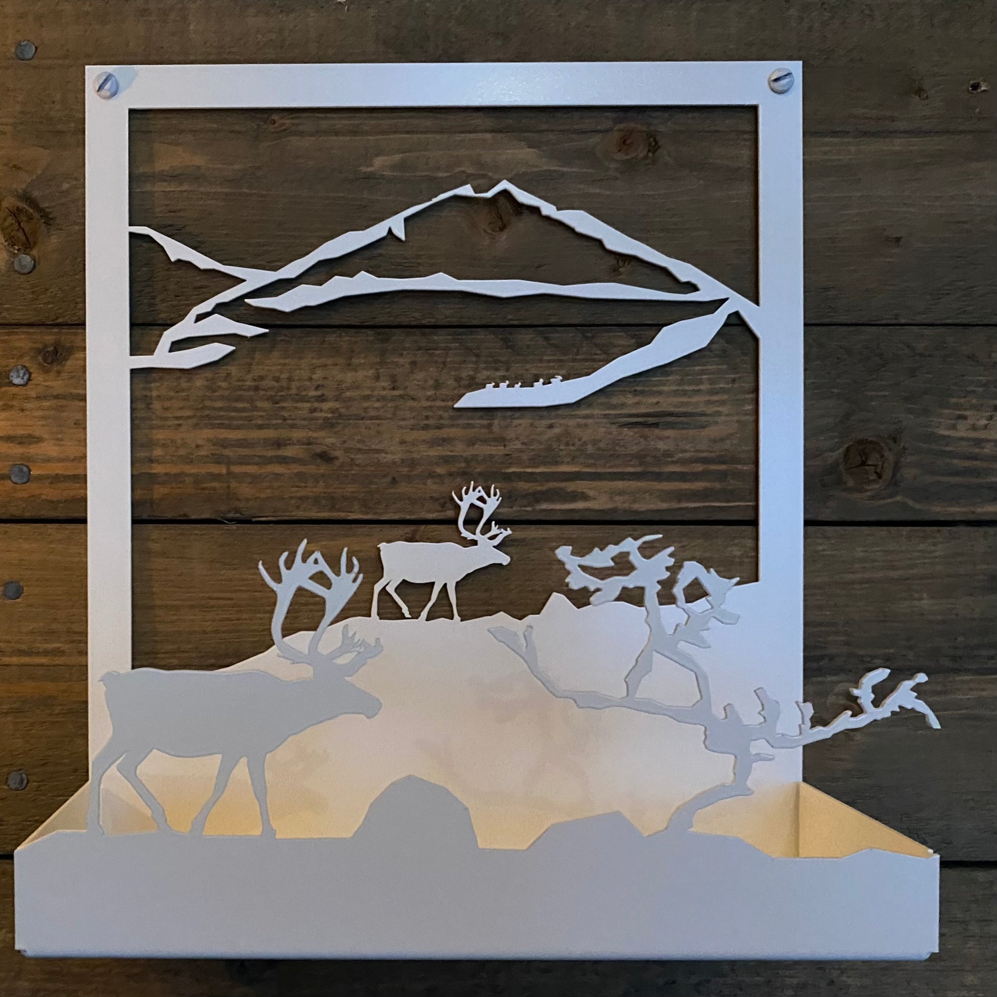 Väggljusstake i vit pulverlackerad plåt. Motivet är en fjällsida med renar och fjäll.