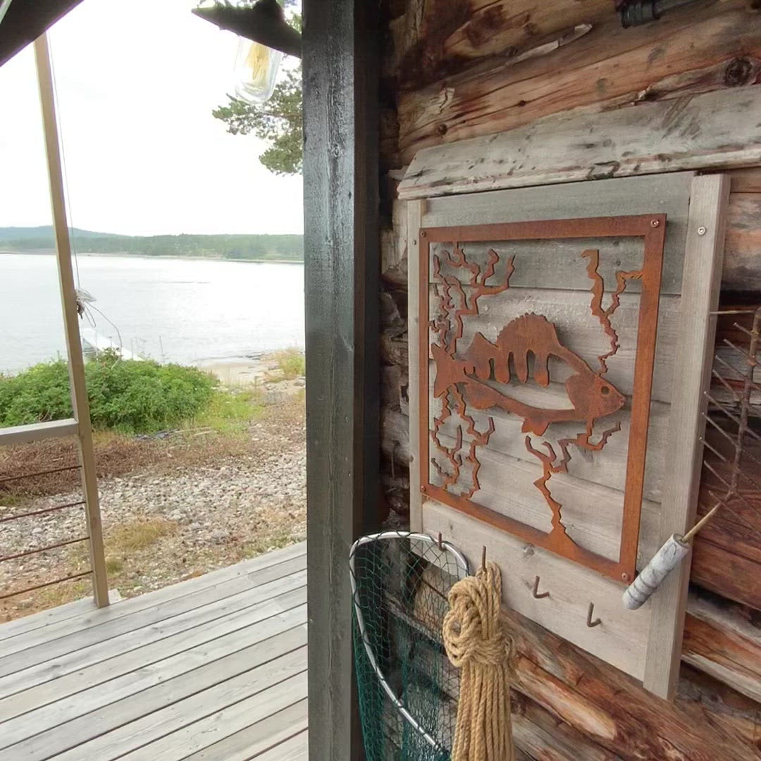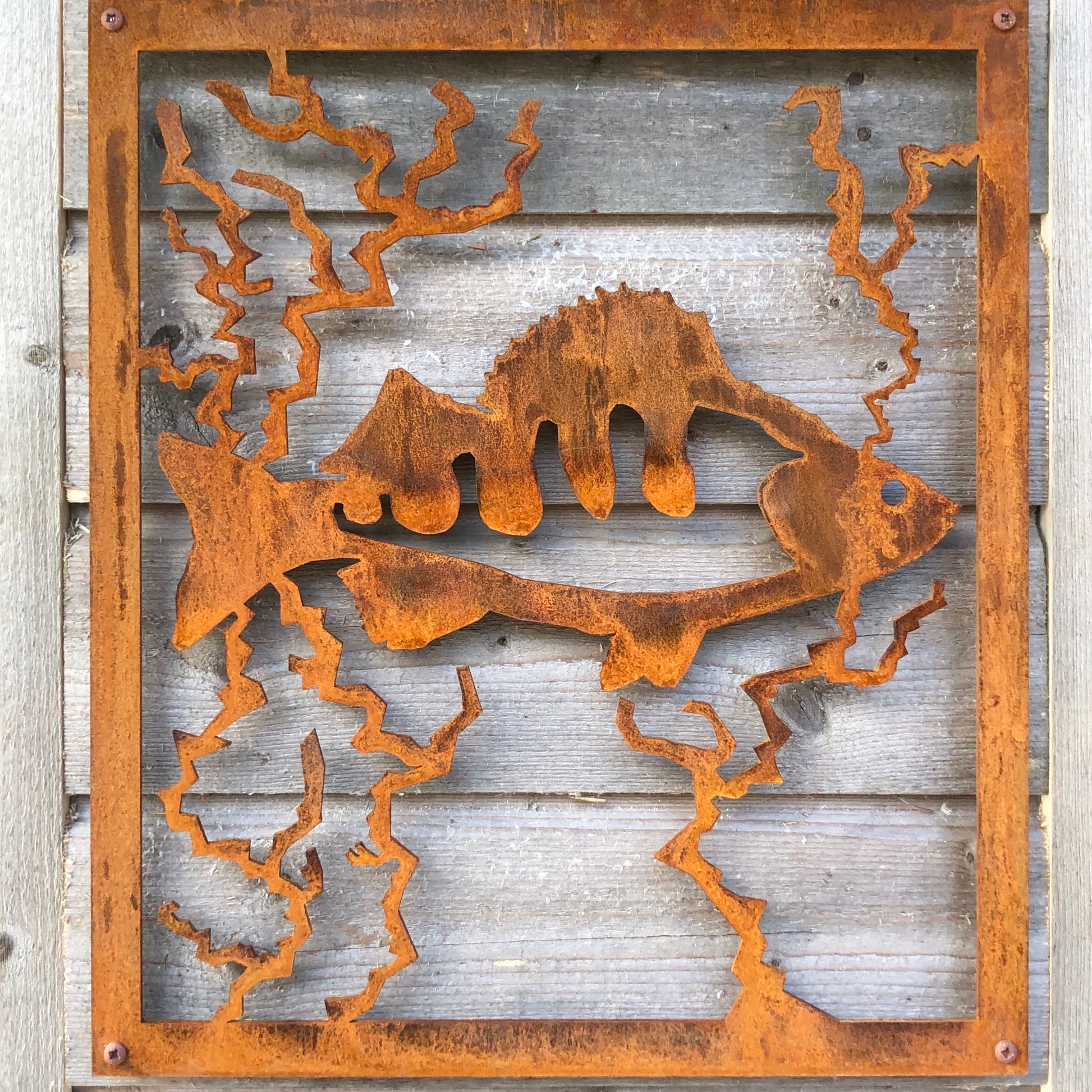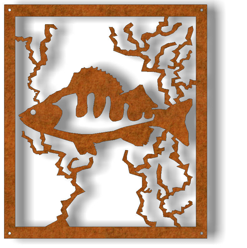 Väggplatta Abborre är tillverkad i cortenstål och levereras rostig tillsammans med 4 träskruvar och 4 distansbrickor.