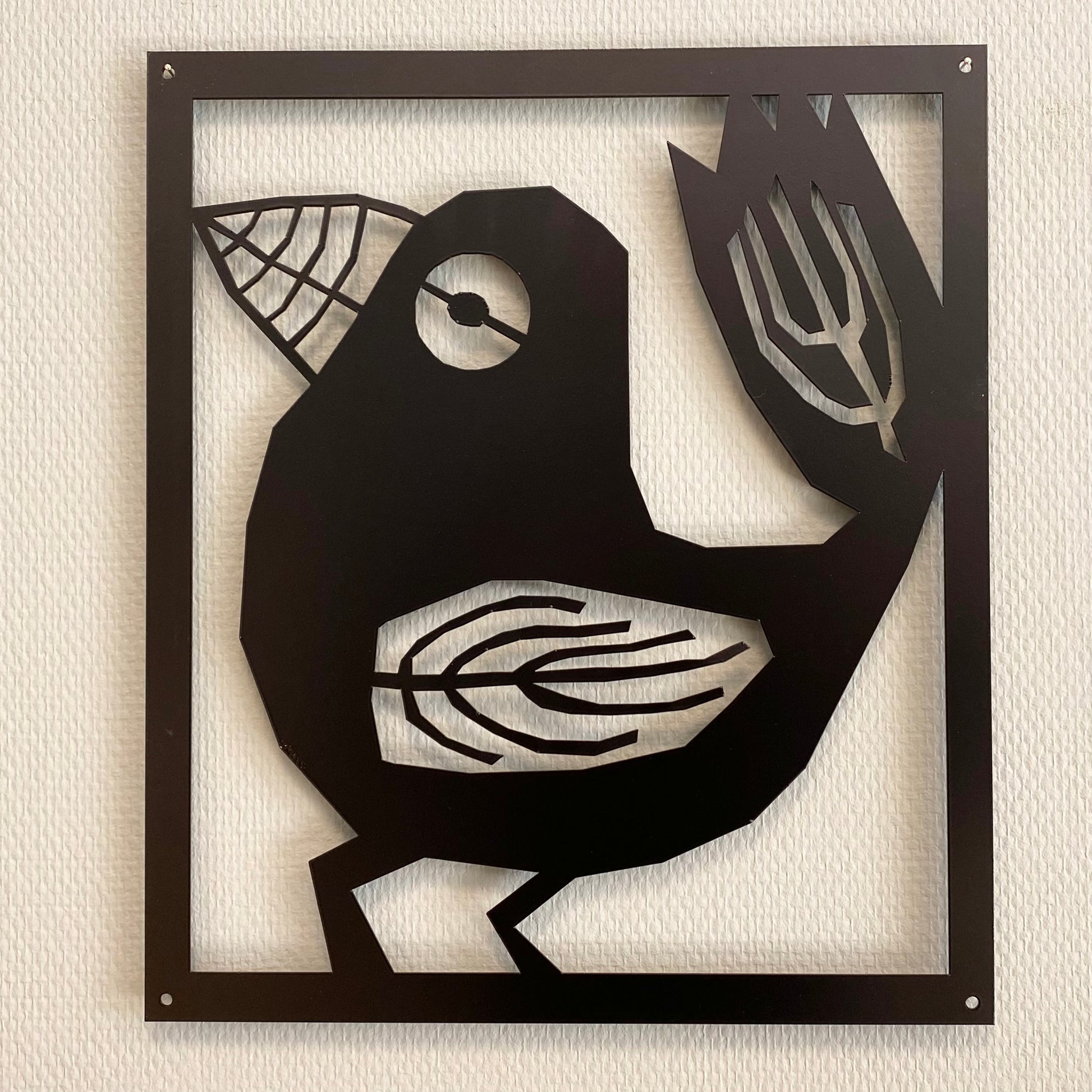 Väggplatta Fågel Fia - svart är tillverkad i pulverlackerad stål och kan användas både inomhus och utomhus. Den levereras med 4 träskruvar och 4 distanser.