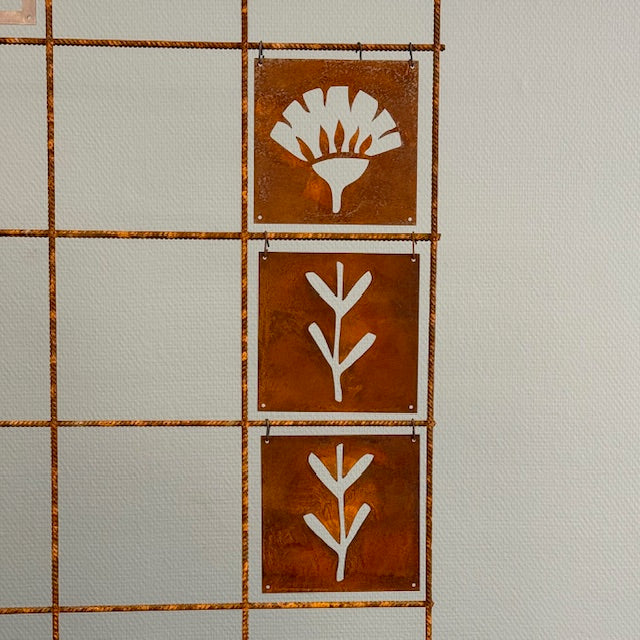 Prydnadsplattorna är 13 x 13 cm med hål i varje hörn för fastsättning. Ståltråd för fastsättning medföljer.